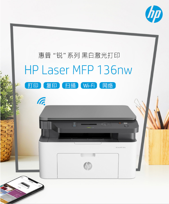 惠普(HP) 136nw黑白多功能一体机复印扫描办公(三合一+有线/无线连接)