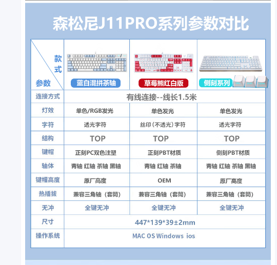 森松尼/sunsonny J11PRo 键盘 机械键盘有线104键静音茶轴 白蓝黄【冰魄青轴】旗舰版升级芯片